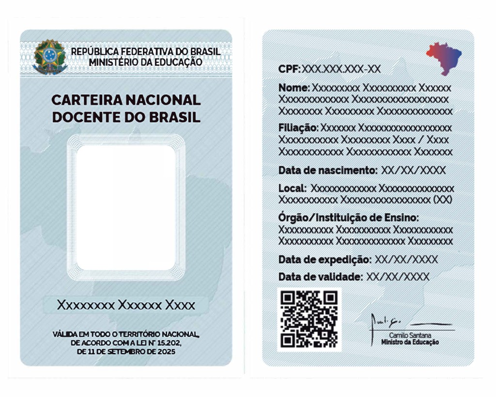 Figura 1 - Imagem do anverso e reverso da Carteira Nacional de Docente no Brasil - CNDB com todos os elementos visíveis e variáveis.